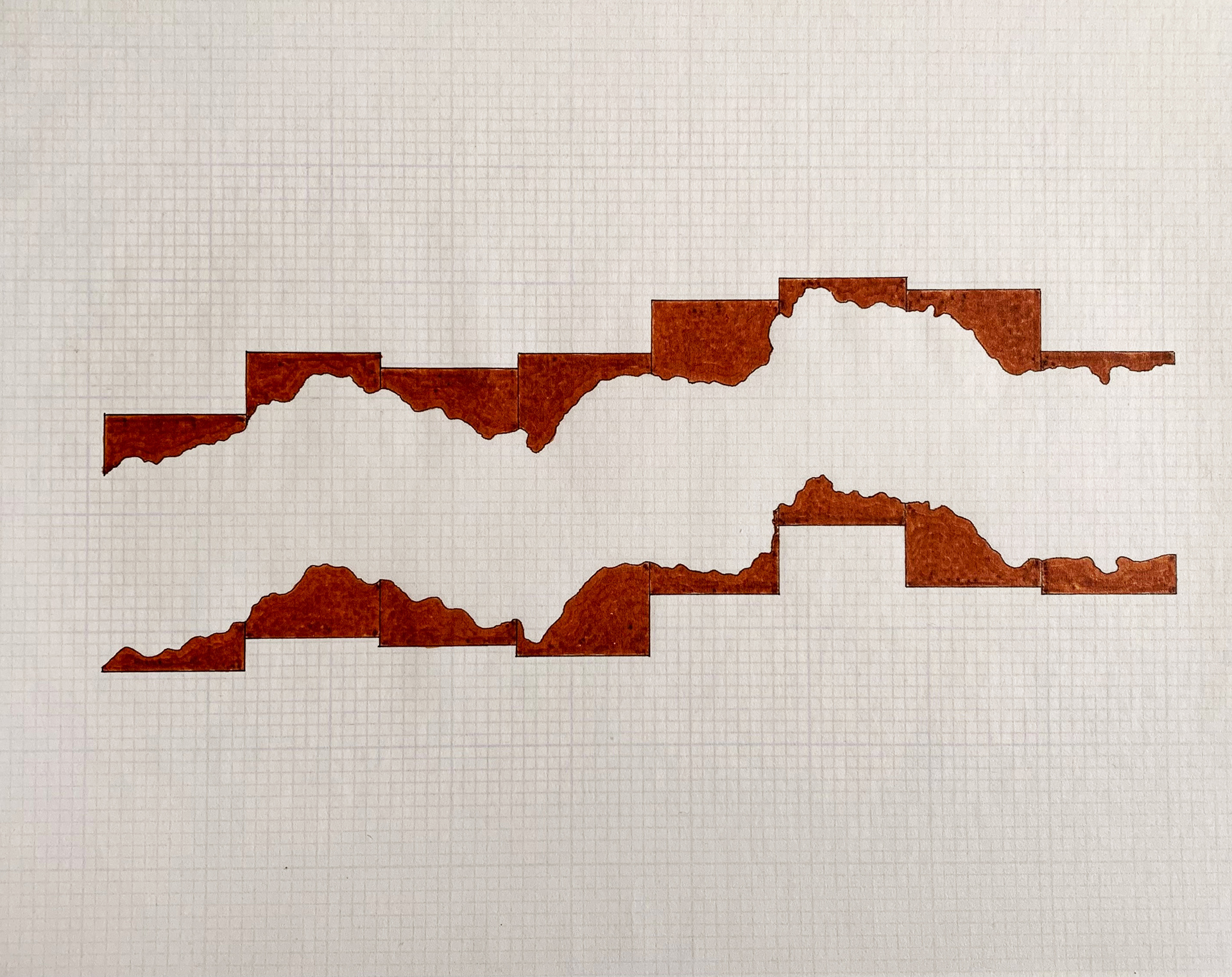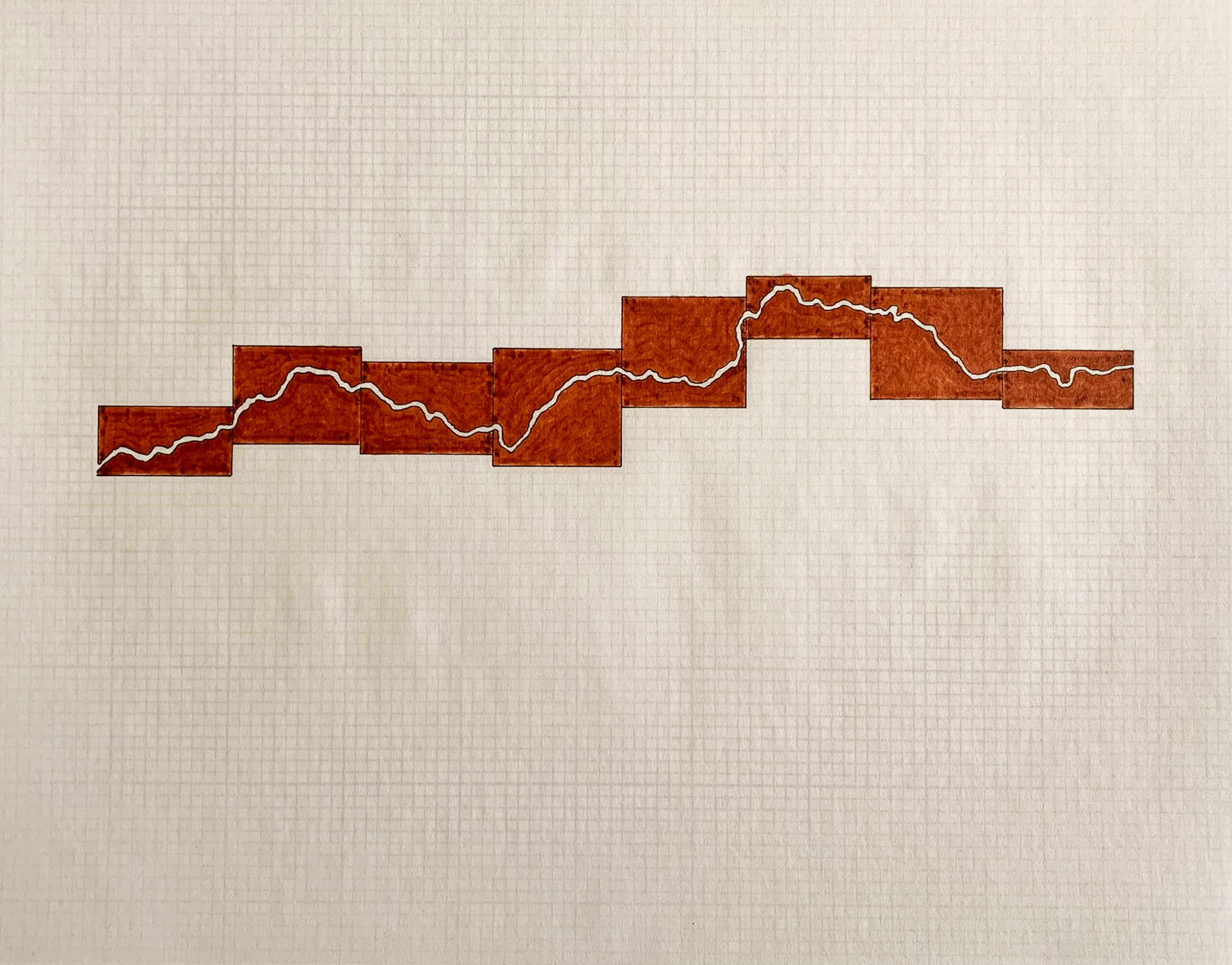 [OW8] Ox-Bow Water-line prep drawing #7 for Malmo installation, 2021 ink and color pencil on card stock Paper size: 8.5 x 11 in (21.59 x 27.94 cm) Framed: 9 x 11.5 x 0.5 in (22.86 x 29.21 x 1.27 cm)